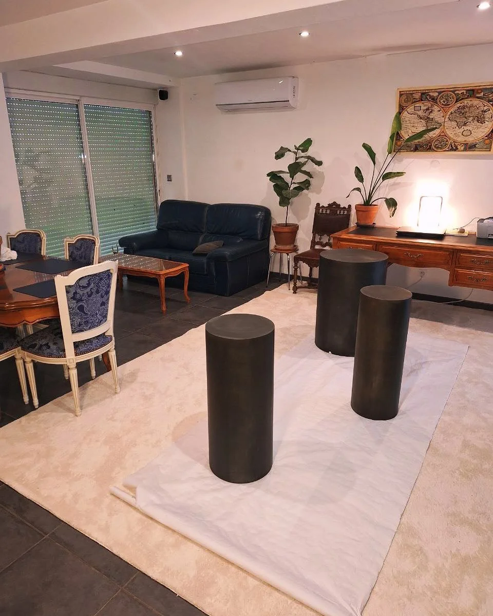 Fabrication de trois pieds de table de diamètres différents en acier patiné.